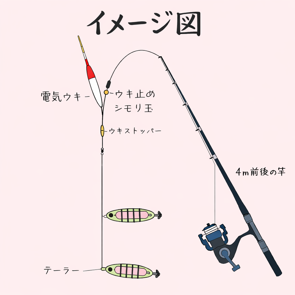 テーラーと呼ばれる、蛍光色のエギのようなものに、塩締めササミやキビナゴを針金で固定し、ウキで浮かせて釣る一般的なヤリイカ釣りの仕掛けになります。
