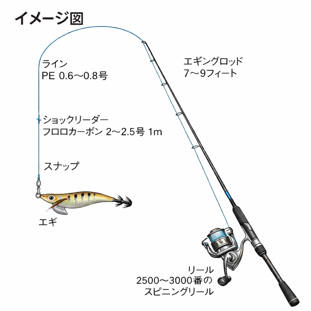 エギに塩締めササミを針金でグルグル巻きに固定し、エギングと同様に投げてシャクリを入れ、フォールでイカにアピールして釣るタイプ。
