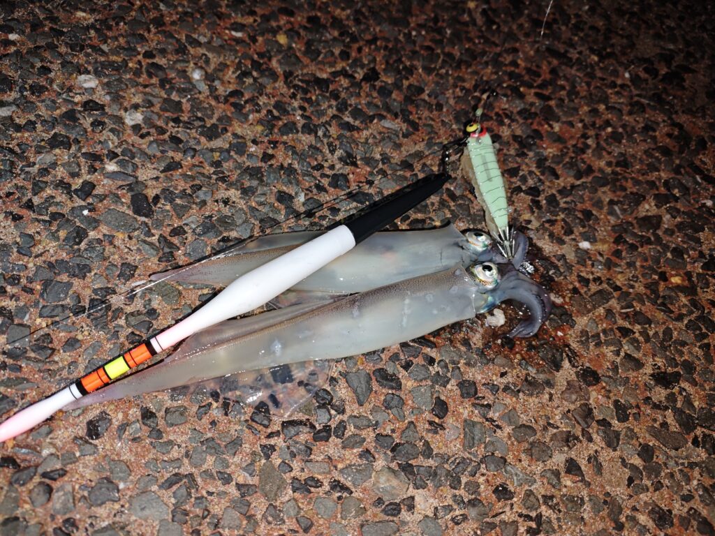 夕マヅメ過ぎた辺りでポツポツと釣れ、朝マヅメ前に再び群れが回遊。エサ巻きテーラーでの釣果が6割、邪道エギ2割、エギング2割。タナは底付近のほうが反応がよく、エサ巻きテーラーもフタヒロと深いところで反応が良かった。