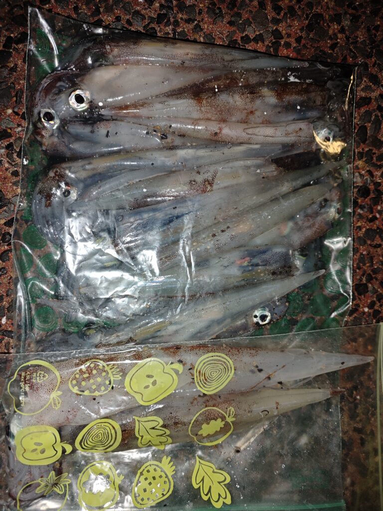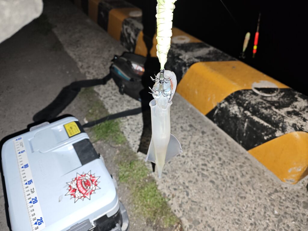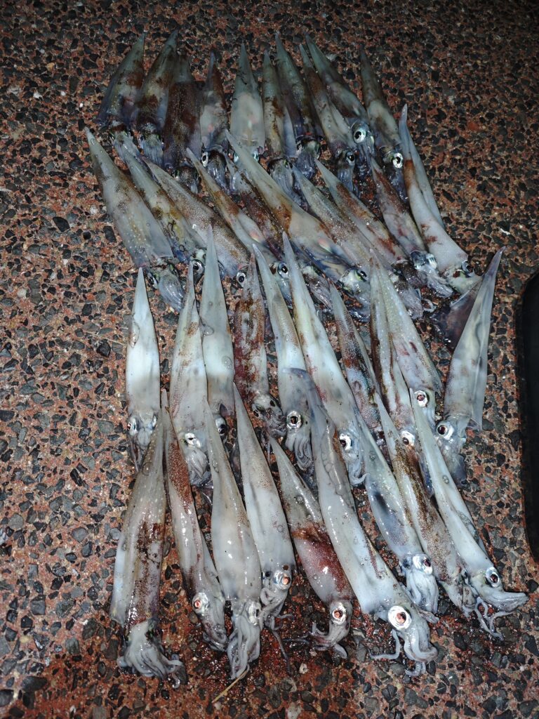 釣行時間17時〜翌2時まで。爆風が収まった20時頃にようやく初ヒット。同じタイミングで周りも釣れ始めた。その後は10〜15分おきに2〜3杯釣れては沈黙の繰り返し。メスが9割でオスは1割程度。他県で釣れるヤリイカに比べサイズは小さい。前日と違い、タナは中〜表層付近で反応が良かった。取り込み時、テトラにぶつかって外れてしまうことが多々あるため注意。